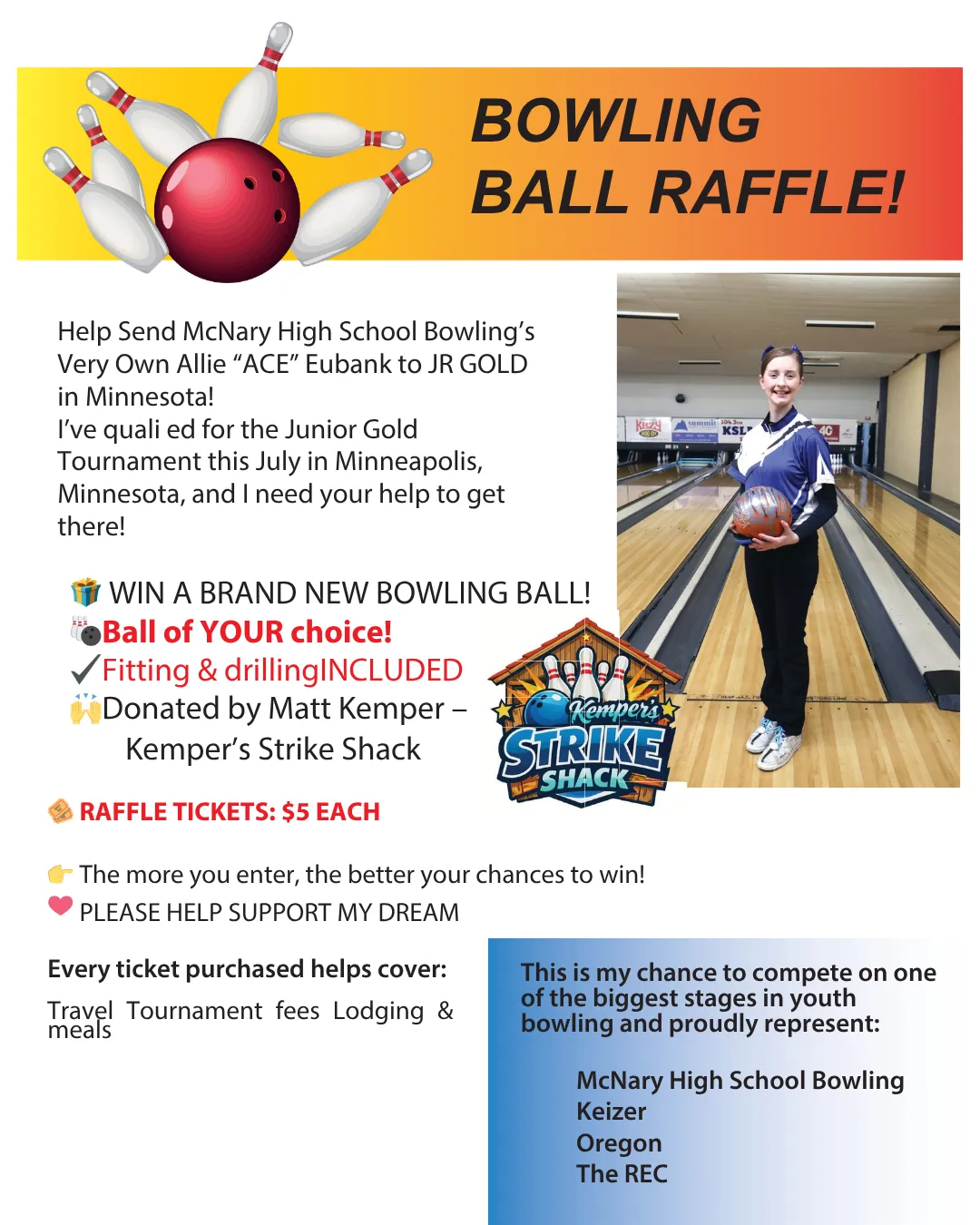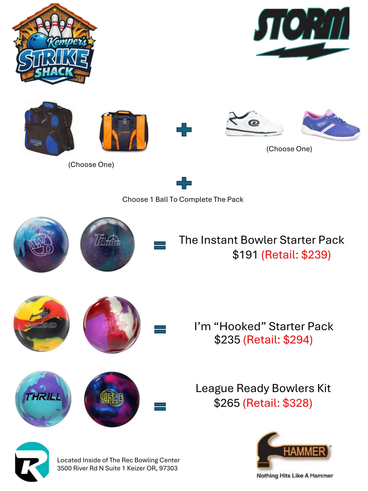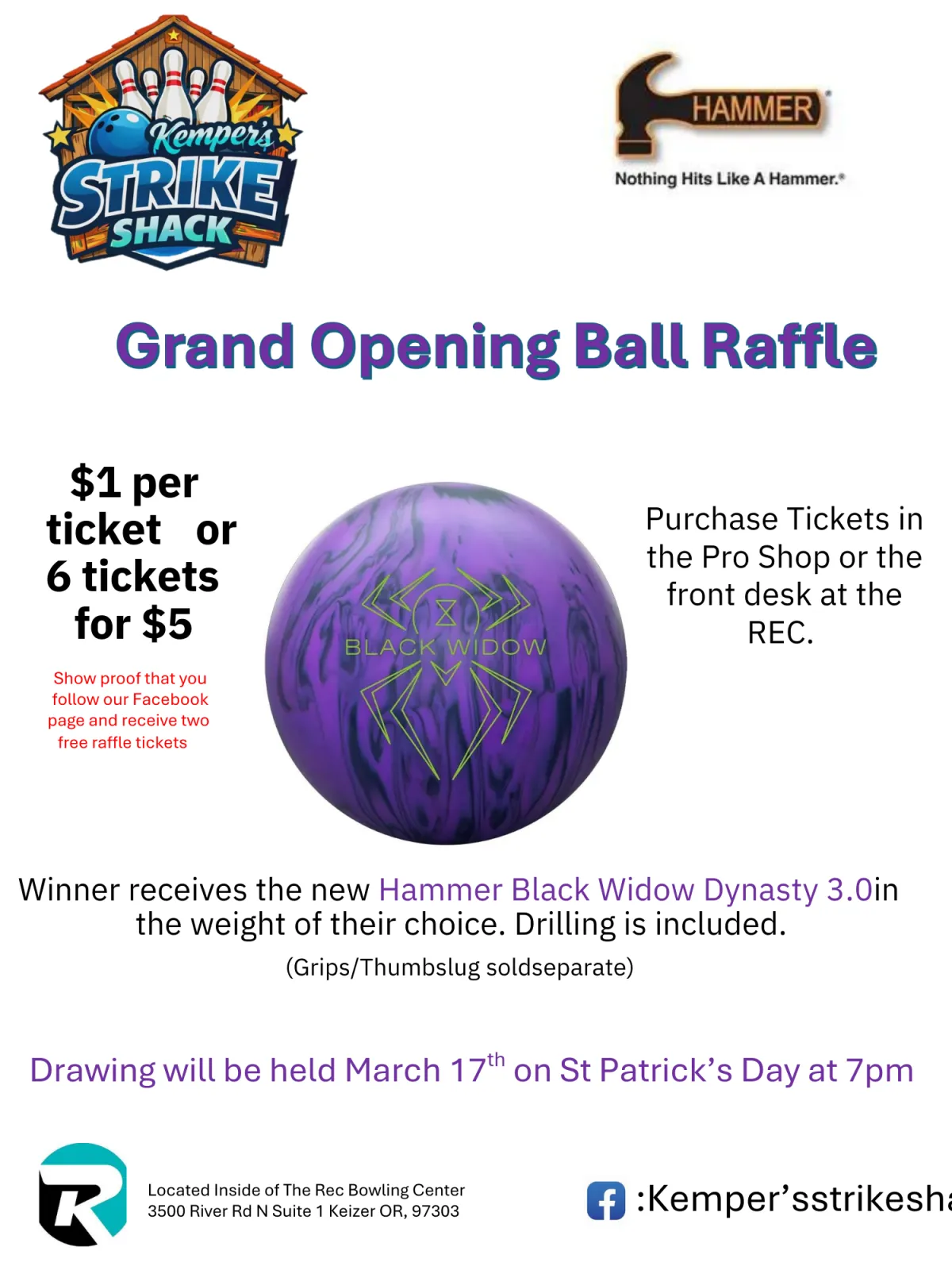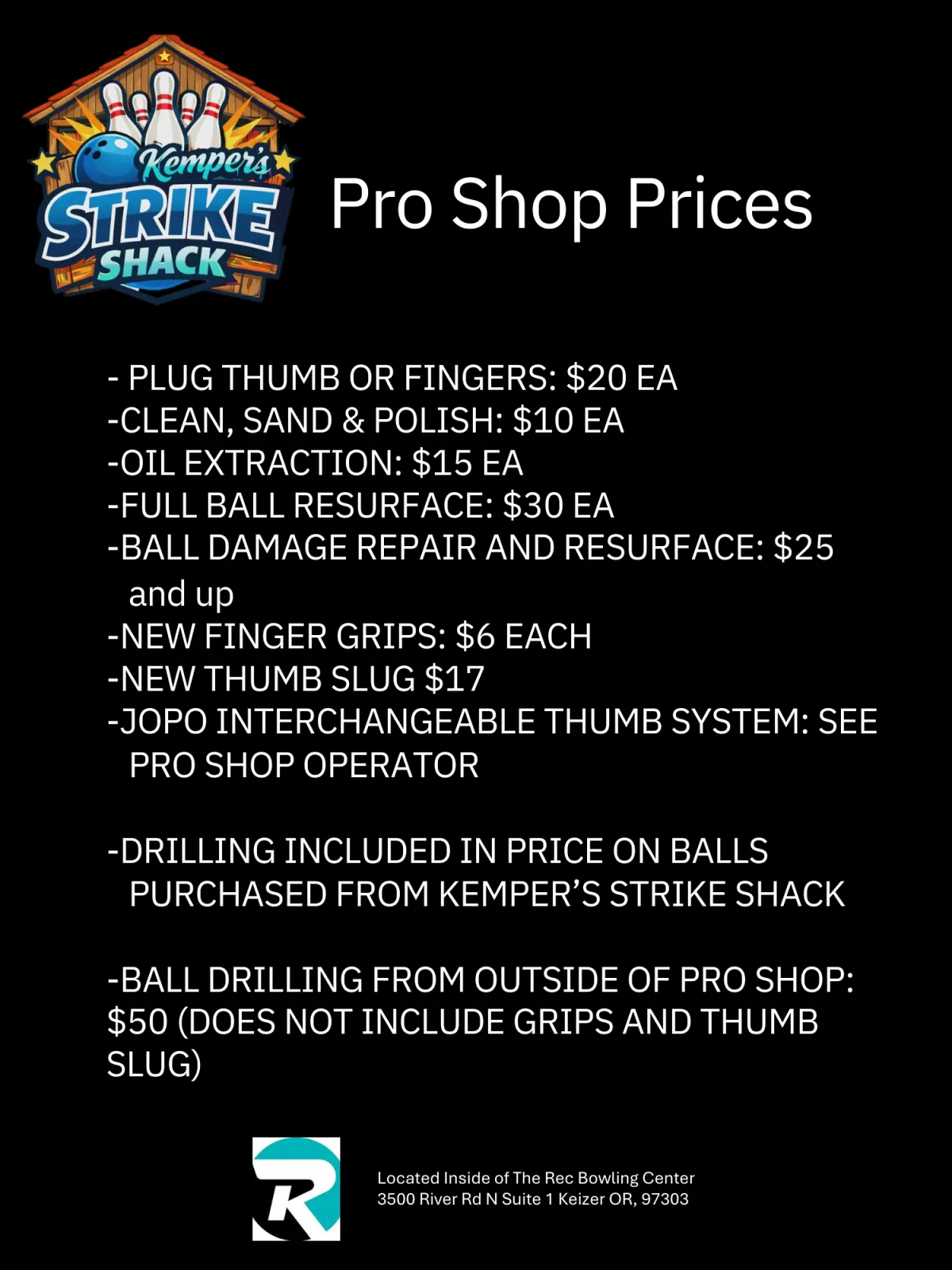 The REC Lanes now has a in house pro shop! We are excited to Partner with Matt Kemper, he has brought his expertise into the building. He offers a wide range of products and services. We are thrilled we can help you now with every step of your bowling journey from ordering the ball to drilling the holes. Below are a list of products, services and times the pro shop is open! Come check it out!
